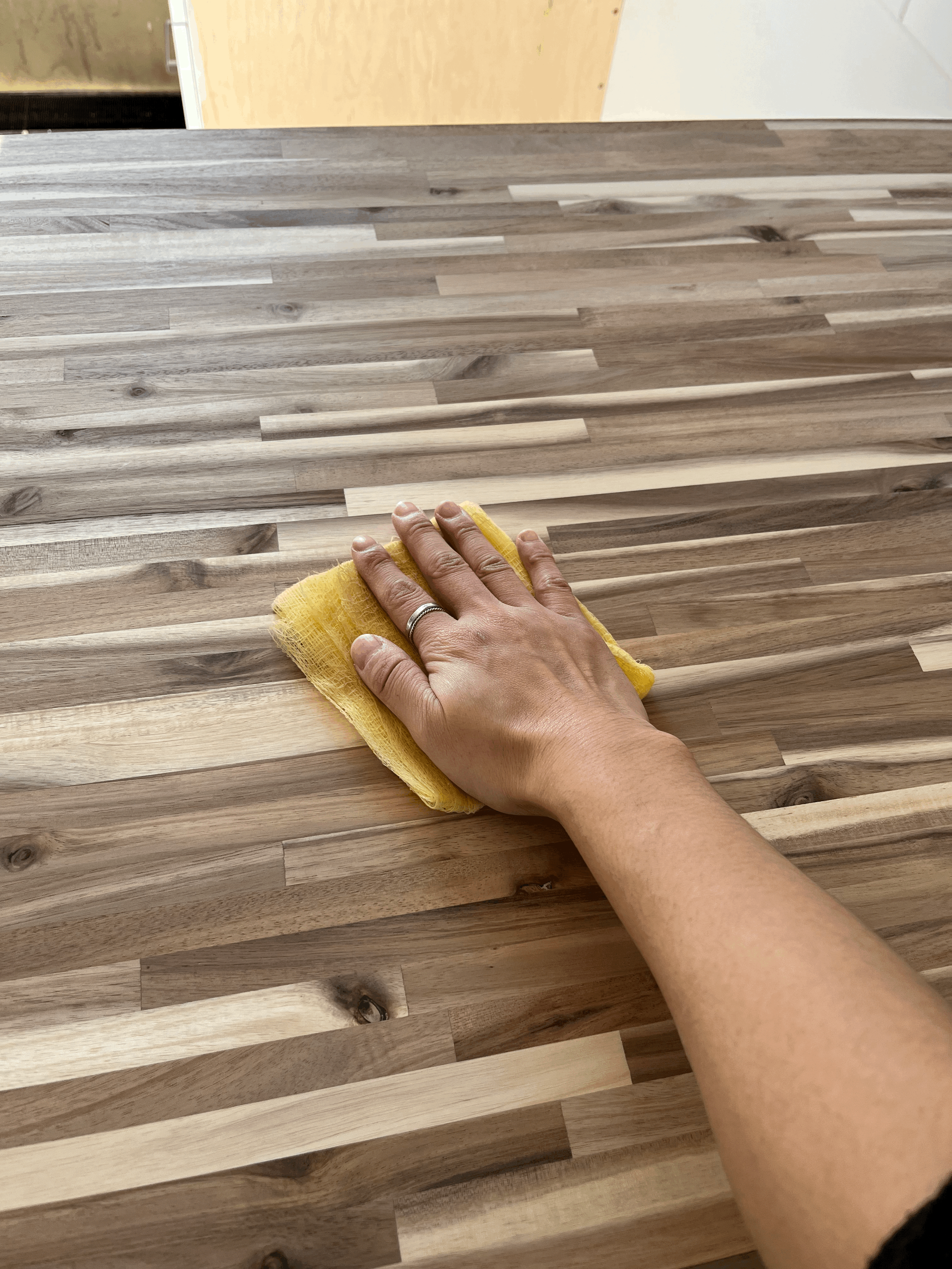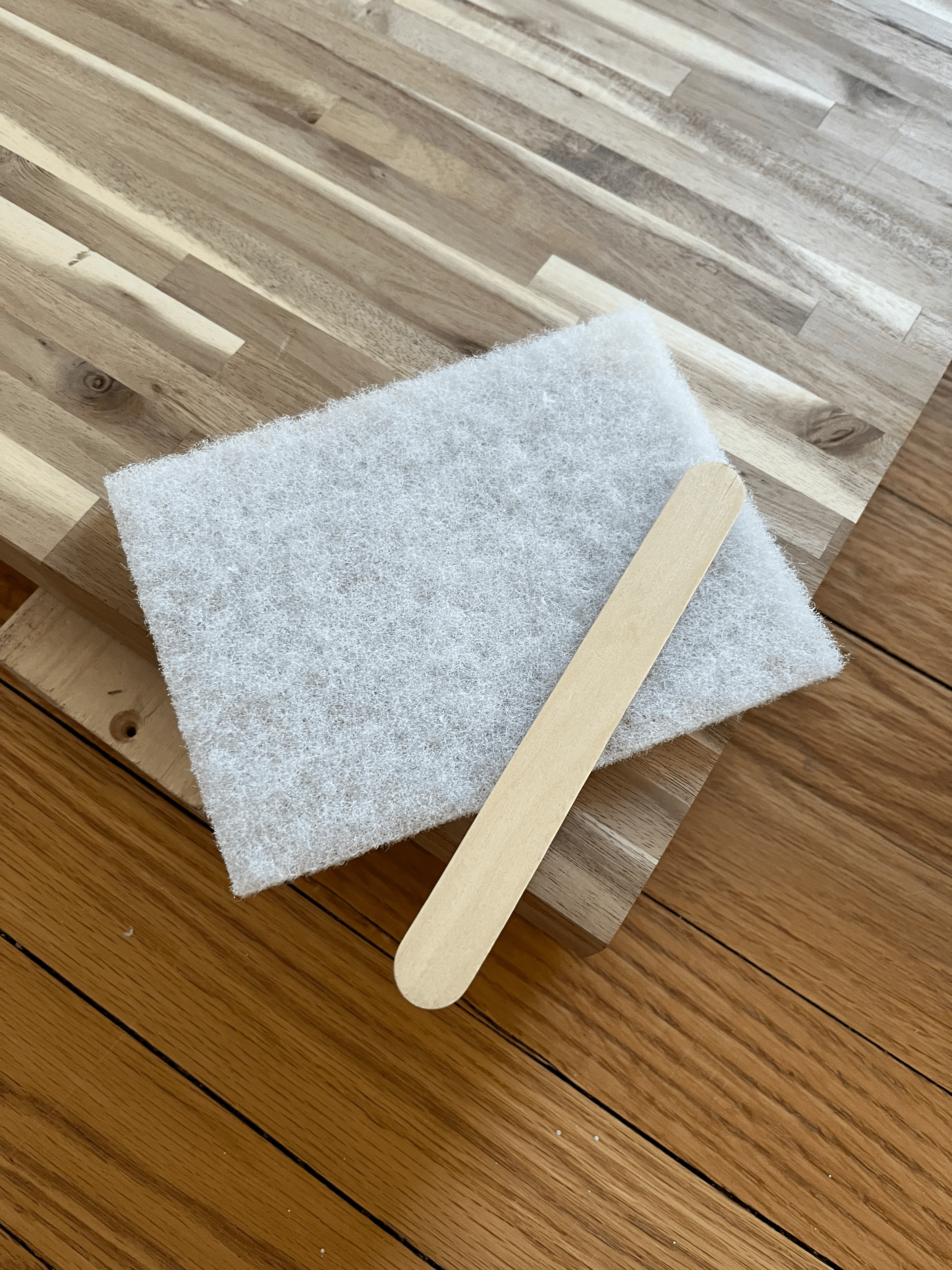 Before appyling the oil, I sanded the butcher block countertop lightly and wiped it off with a tack cloth.