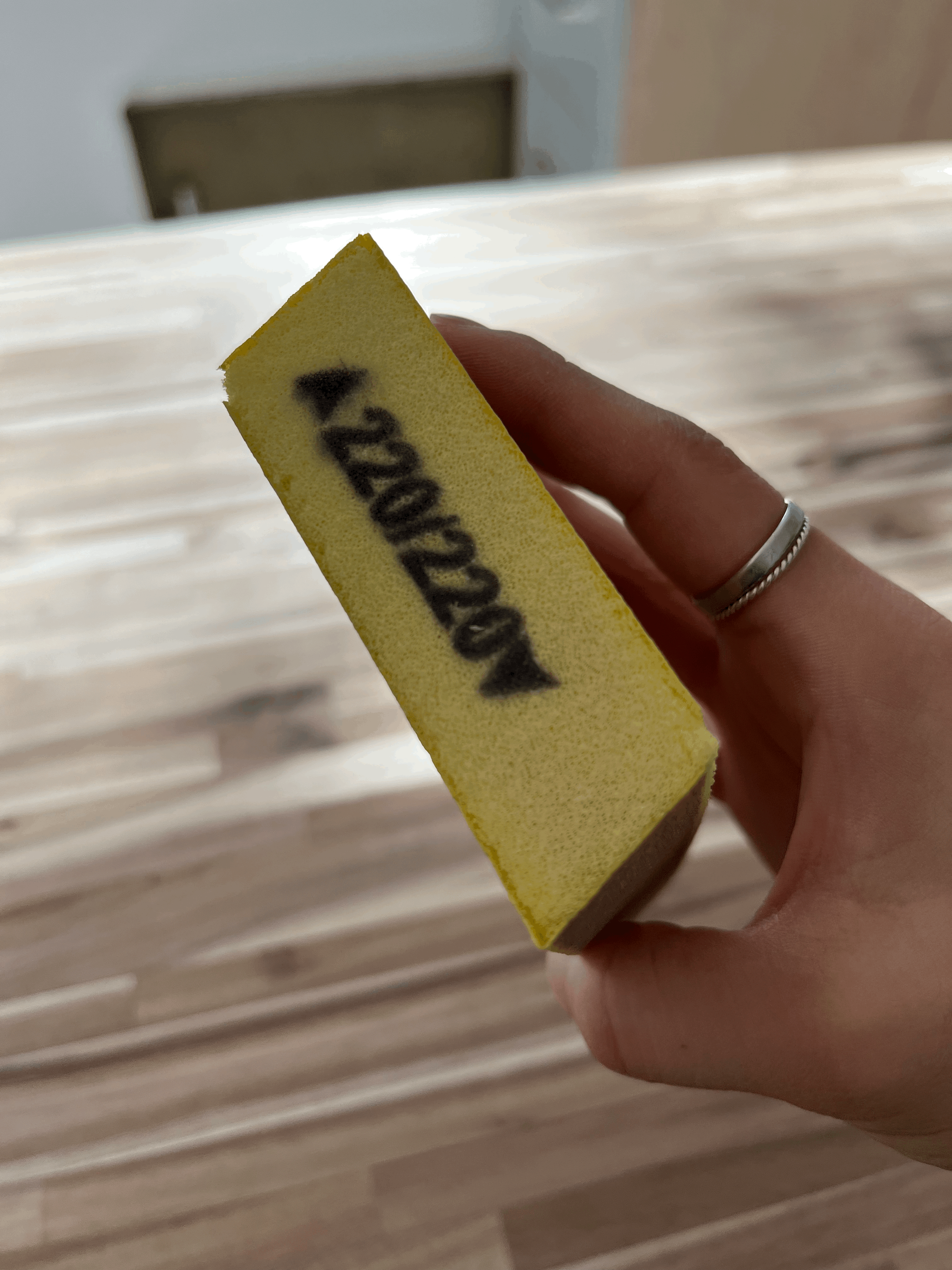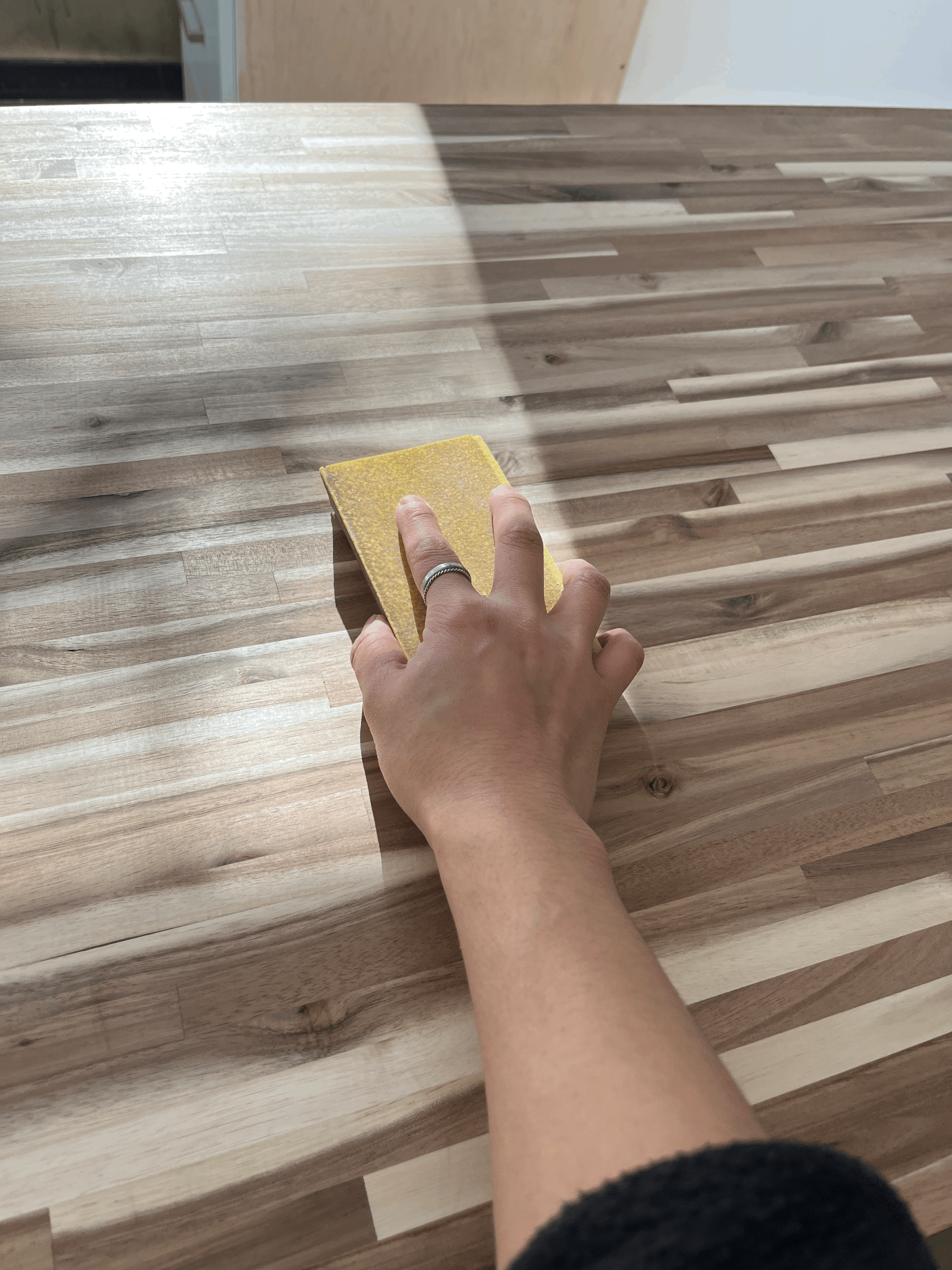 어쨌든, 처음 원목 상판을 설치하기 전에 미리 샌딩 작업(나의 경우는, 180 grit과 220 grit으로만 샌딩했다)도 하고 먼지도 다 닦아줬지만, 그 이후에 oil을 바르기까지 꽤 긴 시간이 지나서 먼지도 새로 닦을 겸 220 grit 샌딩 블락으로 샌딩도 아주 가볍게 다시 했다.